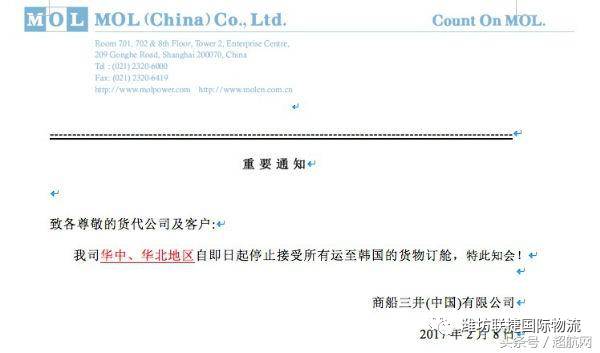 2月8日,商船三井(中國)有限公司官網(wǎng)發(fā)布通知稱,商船三井(華中、華北地區(qū))自即日起停止接受所有運至韓國的貨物訂艙,請相關(guān)外貿(mào)、貨代公司知會!
